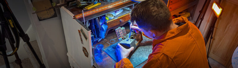 Next, I added the curved stock rail. To create the curve, I pinched the rail between my thumb and forefinger and drew my fingers down along its length ‘ exerting a slight bending motion. After several passes, the rail had a gentle curve that closely matched the template. I placed this rail atop the drawing, again aligning the notch for the points above the throw bar, and then aligning the other end near the frog. The rail seemed to be a good match, so using my track gage, I first soldered the rail on either side of the throw bar ‘ making sure not to yet solder the rail to any other ties other than these two. Next, I moved the track gage up to the frog point, and once I was satisfied with the alignment, applied the solder. I continued to move the gage up the frog point, soldering the stock rail as I went, ensuring each point was to gage. Fig.14. Finally, I soldered the last few ties between the frog and the point to the curved rail.